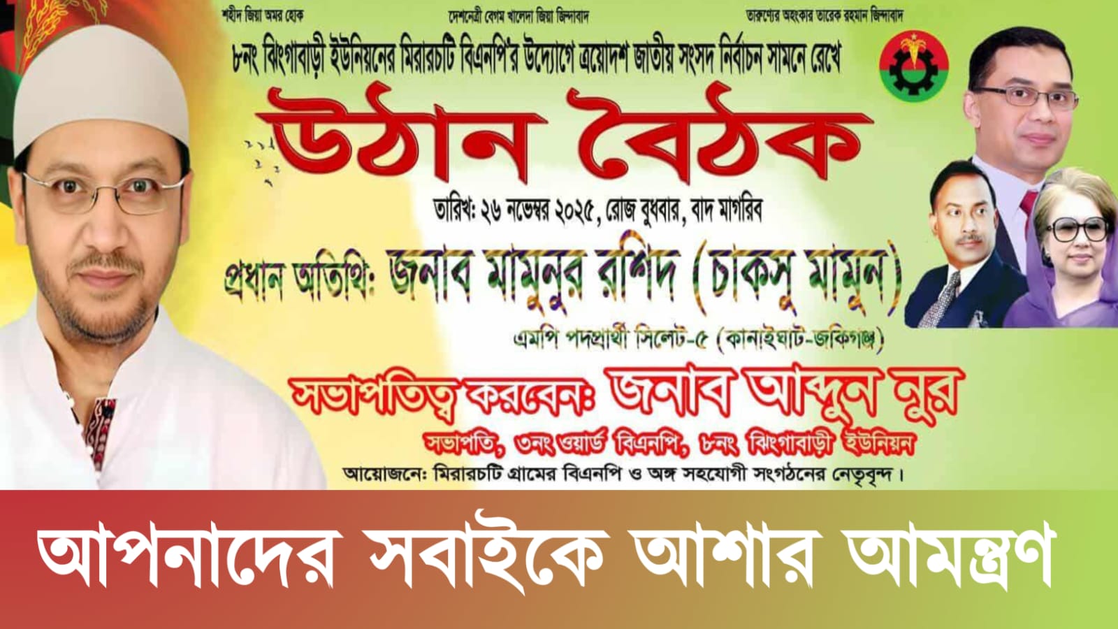 হতাশার চাদরে ঢাকা এই জনপদে আজ মানুষের ঢল নেমেছে। যে কর্মীরা একদিন দলের দুঃসময়ে দিশেহারা ছিলেন, আজ তাদের চোখমুখে নতুন প্রত্যয়ের আগুন। মিরার চটি গ্রামে এই উঠান বৈঠক কোনো সাধারণ সভা নয়, বরং দীর্ঘদিনের বঞ্চনার বিরুদ্ধে এক সম্মিলিত জাগরণ। এটি এমন একজন নেতার প্রতি মানুষের বিশ্বাস ও ভালোবাসার প্রতিচ্ছবি, যিনি দলের সবচেয়ে কঠিন সময়েও কর্মীদের ছেড়ে যাননি সিলেট ৫ আসনের বিএনপির মনোনয়ন প্রত্যাশী মামুনুর রশিদ চাকসু সাহেবের আগমনে মিরার চটি গ্রামে উঠান বৈঠক ২৬ নভেম্বর ২০২৫ রোজ বুধবার বাদ মাগরিব মিরাট চটি পূর্ব সৈয়দ আব্দুর রহমানের বাড়িতে অনুষ্ঠান হবে মিরাট চটি বিএনপি অঙ্গ সংগঠনের পক্ষ থেকে আপনাদের সবাইকে আসার আমন্ত্রণ আয়োজনে মিরাট চটি গ্রামের বিএনপি ও অঙ্গ সহযোগী সংগঠনের নেতৃবৃন্দ