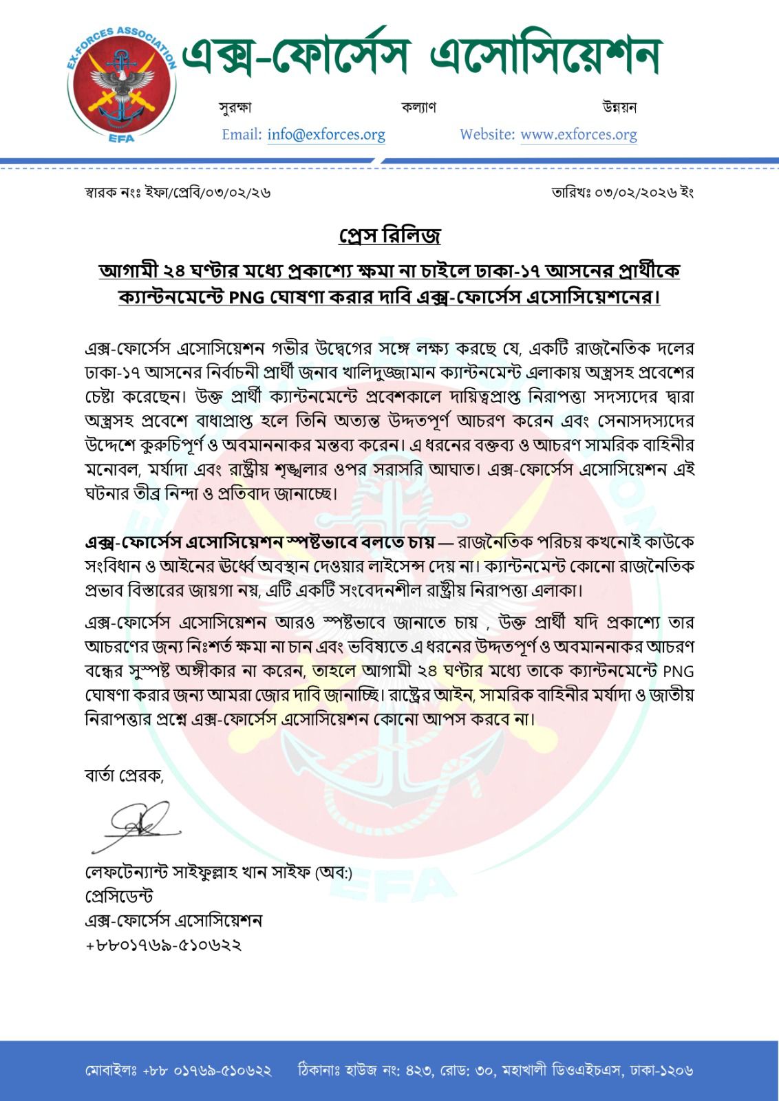 আগামী ২৪ ঘণ্টার মধ্যে প্রকাশ্যে ক্ষমা না চাইলে ঢাকা-১৭ আসনের প্রার্থীকে ক্যান্টনমেন্টে PNG ঘোষণা করার দাবি এক্স-ফোর্সেস এসোসিয়েশনের।