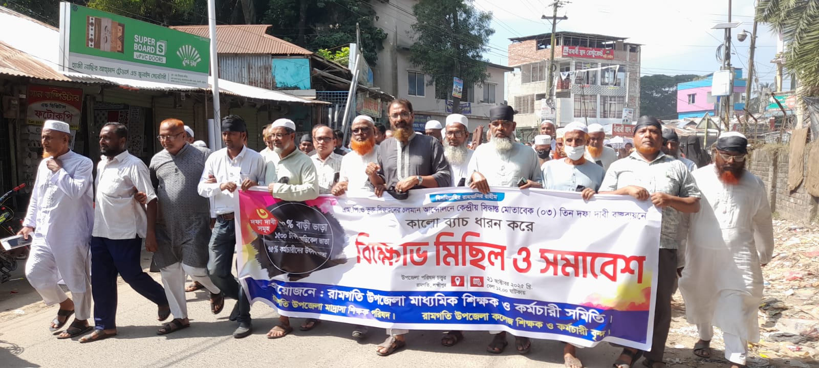 ২০শতাংশ বাড়িভাড়াসহ ৩ দাবিতে লক্ষ্মীপুরের রামগতিতে বিক্ষোভ মিছিল ও সমাবেশ করেছে এমপিওভুক্ত শিক্ষক ও কর্মচারীরা।