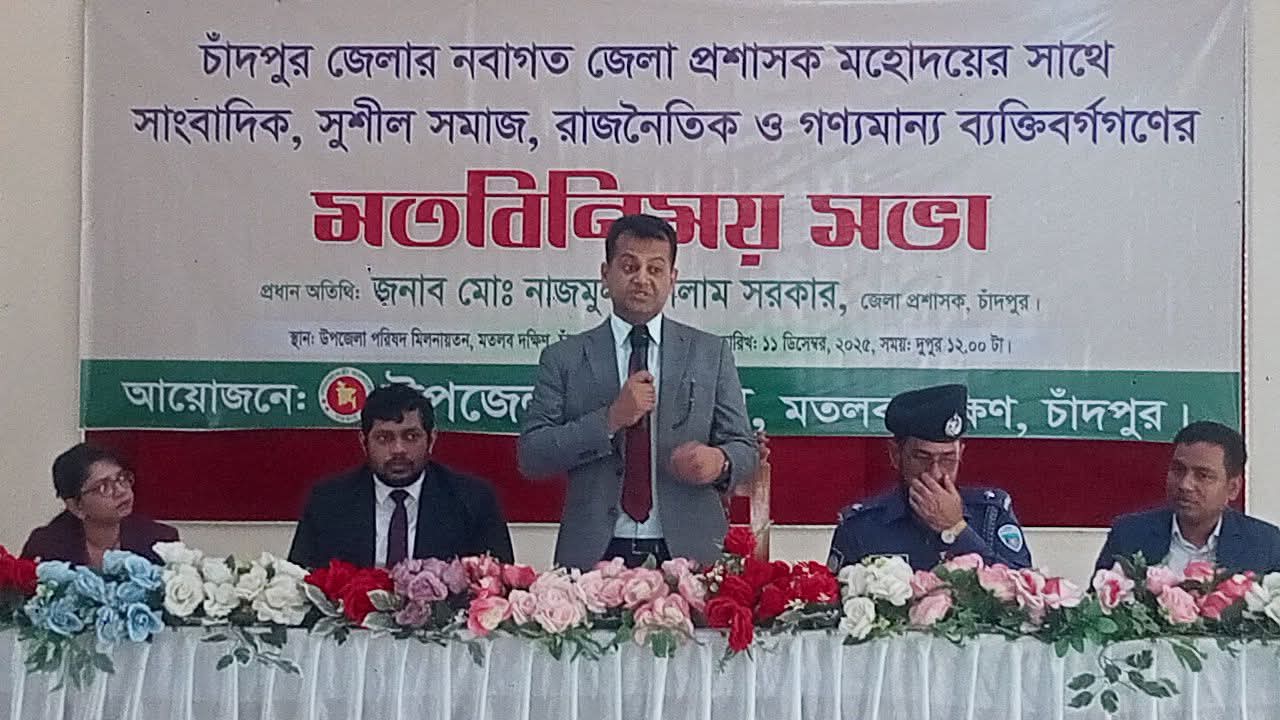 চাঁদপুরের মতলব দক্ষিণ উপজেলায় নবাগত জেলা প্রশাসকের সাথে সাংবাদিক, সুশীল সমাজ, রাজনৈতিক ও গণ্যমান্য ব্যক্তিবর্গের মতবিনিময় সভা অনুষ্ঠিত হয়। বৃহস্পতিবার (১১ ডিসেম্বর) দুপুরে উপজেলা পরিষদ মিলনায়তনে মতবিনিময় সভায় উপজেলা নির্বাহী অফিসার কে এম ইশমামের সভাপতিত্বে প্রধান অতিথি হিসেবে বক্তব্য রাখেন চাঁদপুরের জেলা প্রশাসক মোঃ নাজমুল ইসলাম সরকার।